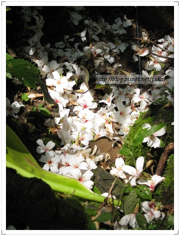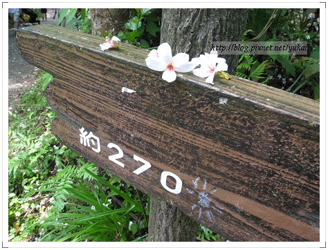 幸虧沿路有油桐花的陪伴, 讓我能夠邊走邊做手工藝, 欣賞油桐花在泥土上、枝幹上、青苔、石階上與水中的美, 有些路段沒有出現油桐花, 我就認真的爬山, 這樣走走停停的, 也大概花了二個鐘頭左右, 很久沒有這樣揮汗如雨了, 山上的叉路很多, 可以通往不同的景點, 一天要走完是不太可能的, 我們應該會常來吧^^