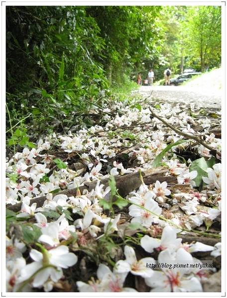 根據網路上的資訊找到了目的地, 果然路邊都已經停滿車輛, 從停車的地方到古道入口是一條僅容納一台車的產業道路, 大約要走 10 分鐘, 柏油路上已經落下些許油桐花歡迎我們的到來, 愈往裡面路邊的油桐花愈多, 看過去就像積雪, 以旋轉之姿落下的花也像是白雪一樣, 難怪油桐花有五月雪之名。